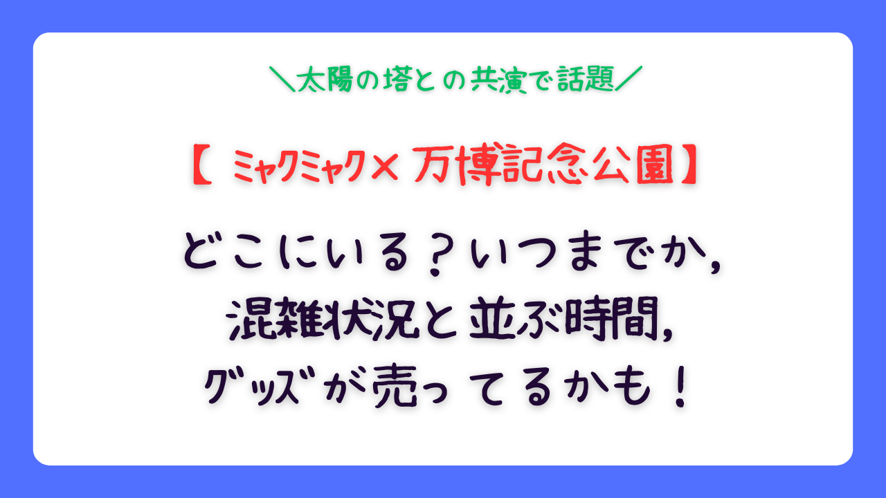 太陽の塔との共演が見られるフォトスポットとして人気が高く、「どこにいるのか」「いつまで見られるのか」「どのくらい並ぶのか」「グッズは公園で買えるのか」といった疑問を持つ人も多い状況です。