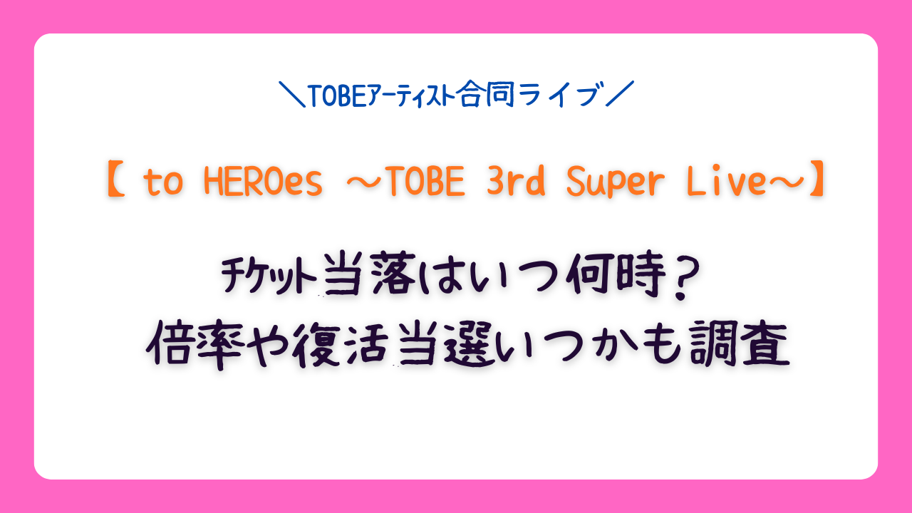 ここまでTOBEライブ「to HEROes 3rd Super Live」のチケット情報を徹底解説しました。時系列で振り返ると、先行申込は明日から、当落は3月4日朝頃、倍率20~30倍、復活は中旬と、タイトスケジュールです。
