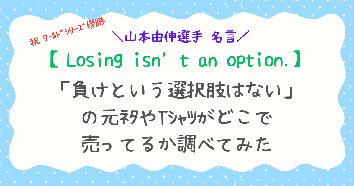 - 山本由伸選手の名言「Losing isn’t an option.」は、元々の日本語発言の強い意志を通訳が見事に英語表現で強調したもの。